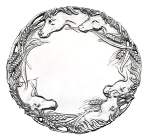Vendor: Arthur Court 12-inch round horse tray Crafted from lustrous aluminum alloy Handsome horses design Handwash to preserve the poli